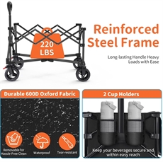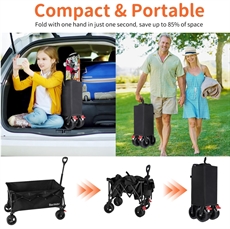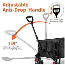 Vagnen har en stark metallram för hållbarhet och stabilitet vid transport av tunga laster. Det justerbara handtaget roterar 145° och kan förlängas från 75 till 95 cm, så alla familjemedlemmar kan använda vagnen bekvämt. Handtaget har en låsande led för ökad stabilitet under användning. Vagnen inkluderar ett stort fack, två nätfickor och två mugghållare som håller allt från solkräm till snacks organiserat.