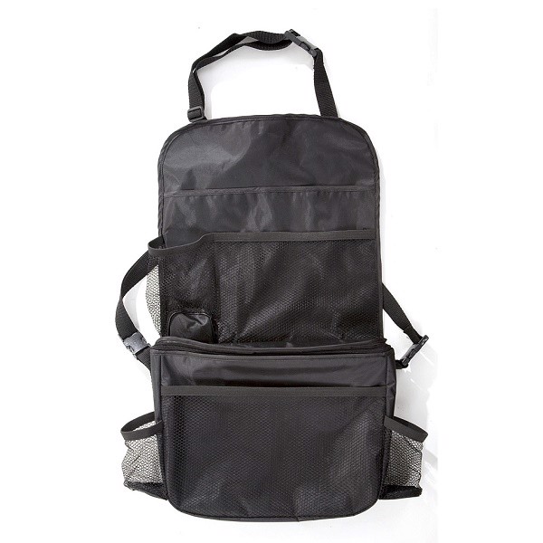 Svart bilorganisatör med flera fickor och remmar för fastsättning, inkl. minst en nätficka.
