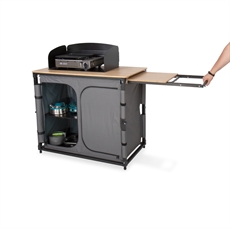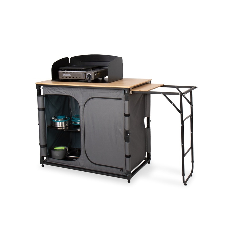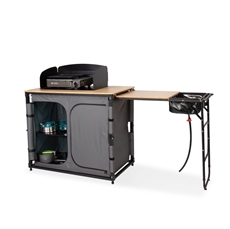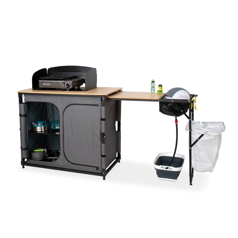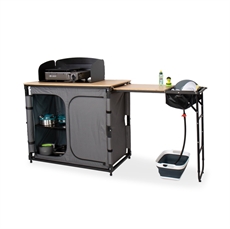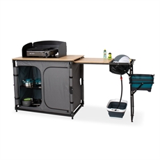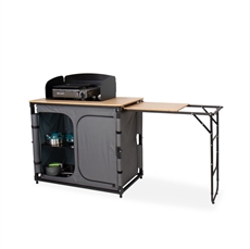 Detta campingkök kombinerar smart förvaring med praktisk matlagning. Den inbyggda förvaringsenheten håller alla köksredskap organiserade och lättillgängliga. Med integrerad diskho och vattenavlopp blir disken enkel, medan den utdragbara sidobordssektionen ger dig extra arbetsyta. Bambusarbetsytan säkerställer en hållbar och lättstädad yta.