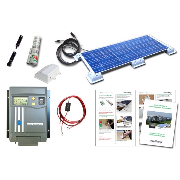 Komplett Solcellsystem för husvagnen. Systemet kan levera el till hela vagnen.