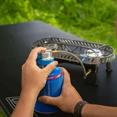 Om du planerar campingturer eller vandringar där effektiv matlagning är viktig, ger denna gasbrännare två kraftiga brännare som kan användas samtidigt. Det betyder att du kan koka vatten och tillaga mat på samma gång, vilket sparar värdefull tid på turen. Piezo-tändning säkerställer enkel antändning utan tändstickor, även i blåsigt väder. Easy Clic Connect och Dual Lock ger en säker patronanslutning, medan den röda/gröna låsindikatorn visar att allt är korrekt anslutet. Den stabila basen med låg tyngdpunkt minskar risken för olyckor på ojämnt underlag.
