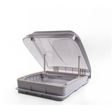 Mörktonad, transparent taklucka med stödarmar och rektangulär ram.