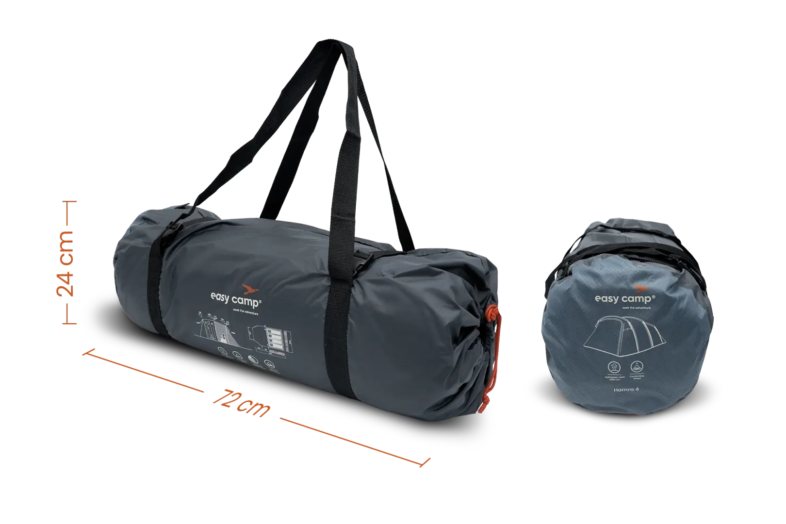 Easy Camp Hamra 4 Familjetält kombinerar pålitligt väderskydd med funktionell rumsfördelning. Vattenpelartrycket på 3000 mm med tejpade sömmar skyddar mot kraftigt regn och säkerställer en torr upplevelse under campingsemestern och helger. Tunnelkonstruktionen med sluttande framsida ger två separata sovkabiner och ett sällskapsrum, vilket ger privatliv för hela familjen. Med bra höjd i sällskapsområdet gör det möjligt att röra sig bekvämt, medan den stora sidöppningen med full mesh-dörr ger enkel åtkomst och bra ventilation på varma dagar. Färgkodningen på stängerna och stångfickorna minskar uppsättningstiden efter resan. Med en vikt på 12 kg är tältet portabelt för både campingplatser och festivaler. WeatherGuard 3000-materialet i ytterduken är flamhärdigt och hållbart, medan SleepTight-sovkabin i andningsbar polyester förebygger kondensbildning. Den sydda botten håller fukt, drag och insekter ute.