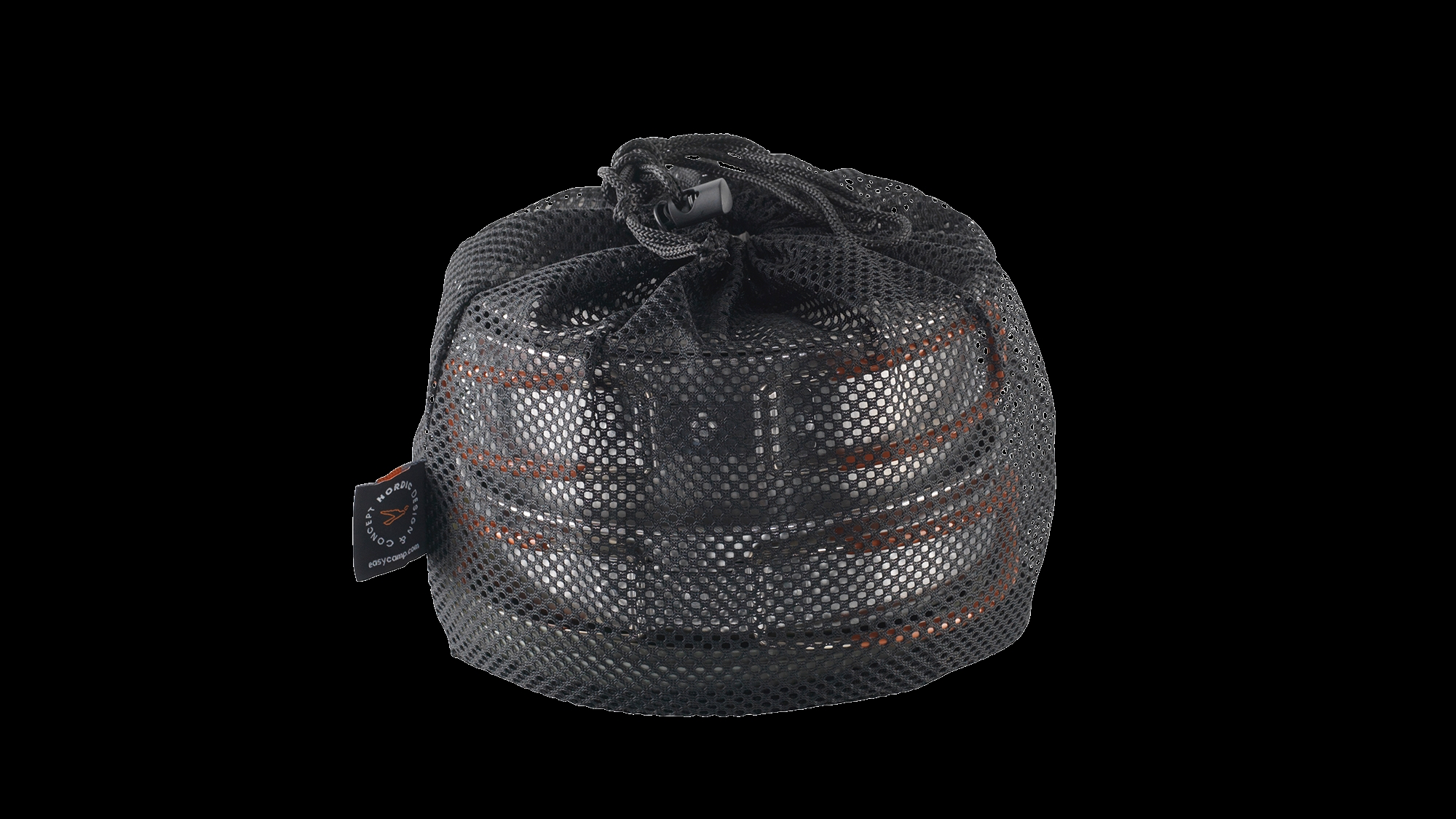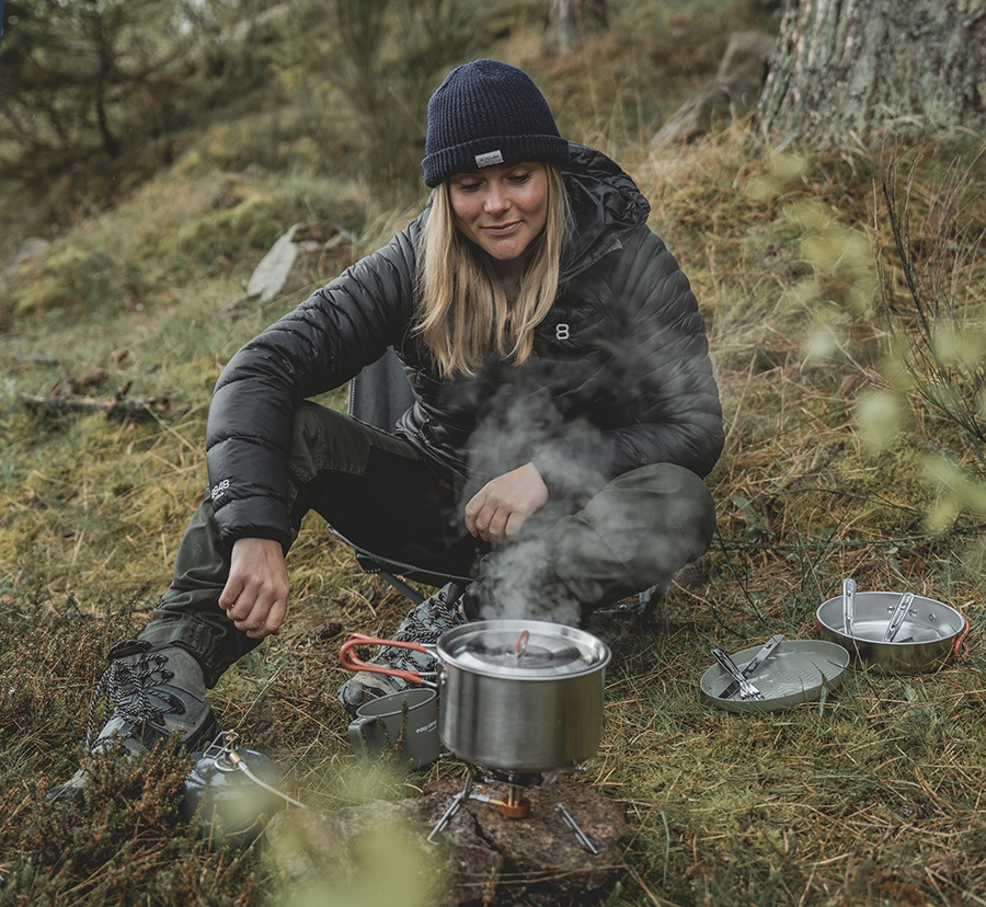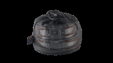 Den stapelbara designen är en stor fördel när utrymmet är begränsat i ryggsäcken. Alla delar passar tillsammans i en kompakt enhet, och den medföljande nätsmesh-bärkassen gör transporten enkel. Silikonaskyddet på handtagen säkerställer säker hantering, även när grytan är varm efter matlagning vid lägerelden.