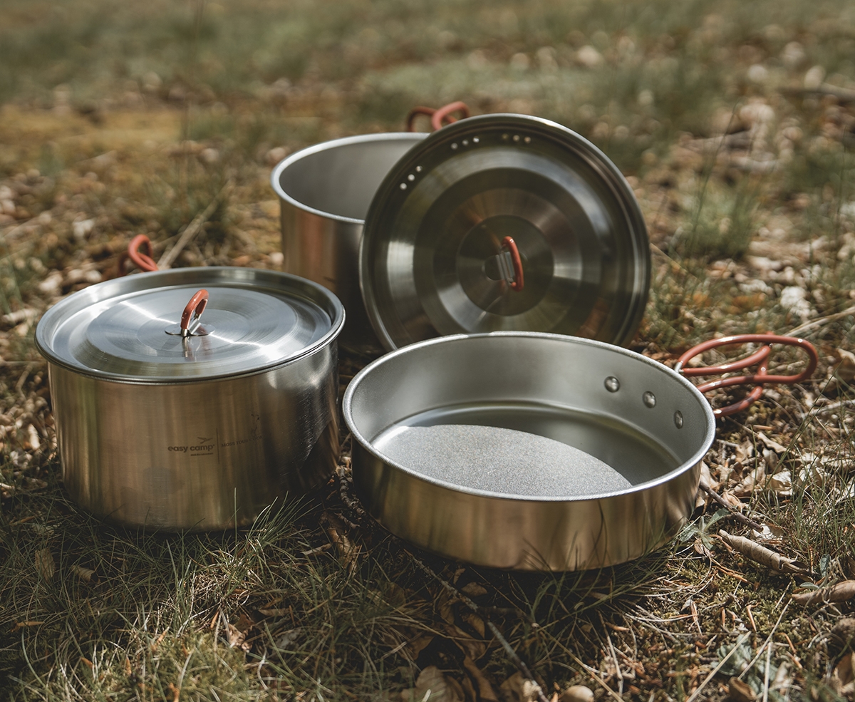 Easy Camp levererar praktisk utrustning för outdoor-entusiaster. Grytsetet är tillverkat av rostfritt stål, vilket säkerställer hållbarhet under svåra förhållanden. Handtagen har silikonöverdrag för skydd mot brännskador, och hela setet tål diskmaskin för enkel rengöring när du kommer hem. Bärväskan i 100 % polyester gör transporten enklare. Hitta mer matlagningsutrustning för dina outdoor-äventyr i vår Matlagning-kategori.