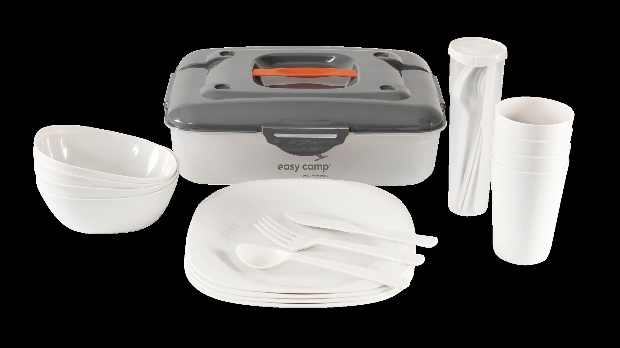Easy Camp Picnic Box M ger dig komplett utrustning för 4 personer samlat på ett ställe – idealiskt för campingturer, där en familj eller en grupp vänner har allt nödvändigt. Med en vikt på endast 1.066 g samlat i en box är setet lätt att transportera, även över längre avstånd. Den kompakta packstorleken på 34 x 25 x 11 cm passar i ryggsäcken eller bilens bagageutrymme för dagsturer.