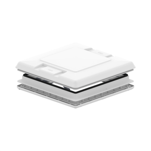 Vit, kvadratisk taklucka med skiktad design, synliga yttre och inre sektioner.