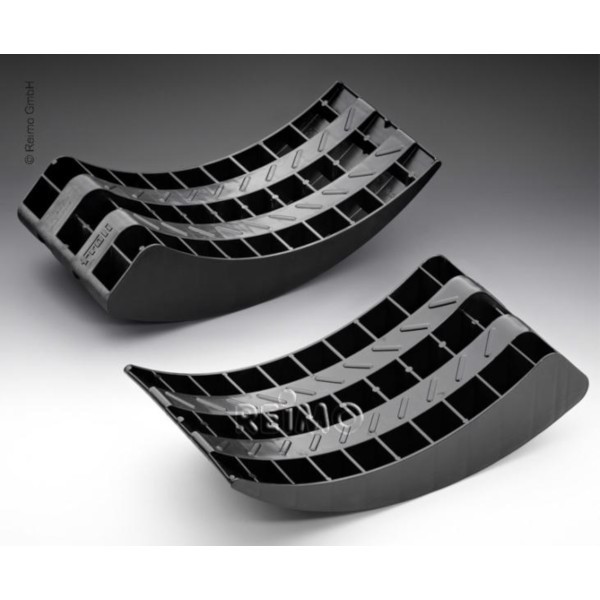 Två böjda svarta block med räfflor, som används för stöd eller lyft, sett i ett set om två.