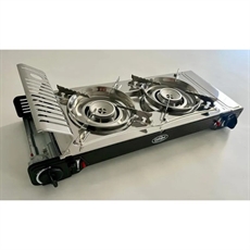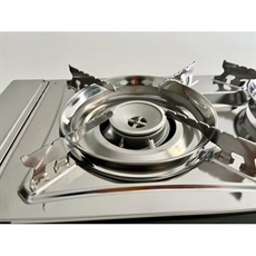 De 2 brännarna (2x 2,2 kW) i patrongasspisen kan drivas oberoende av varandra, eftersom var och en använder en separat gaspatron. Kaminen levereras i etui. Olika tillbehör finns separat, t.ex. brödrosttillbehör, grillplatta, grillpanna.