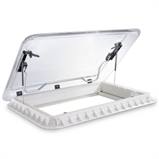 Taklucka med ram, synliga gångjärn och handtag för öppning, eventuellt med justerbara positioner.