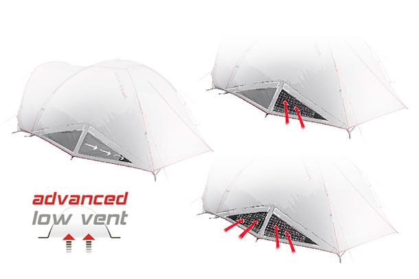 Rymligt sovutrymme med sitt- och ståhöjd på 130 cm. Ingången har praktiskt myggnät. Och med färgade tältlinor så att de syns bättre.