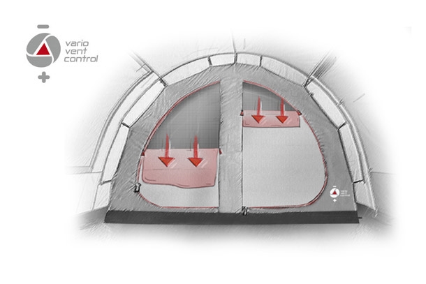 Det mörklagda innertältet med 2 ingångar är utrustat med High Peak Vario Vent Control System.