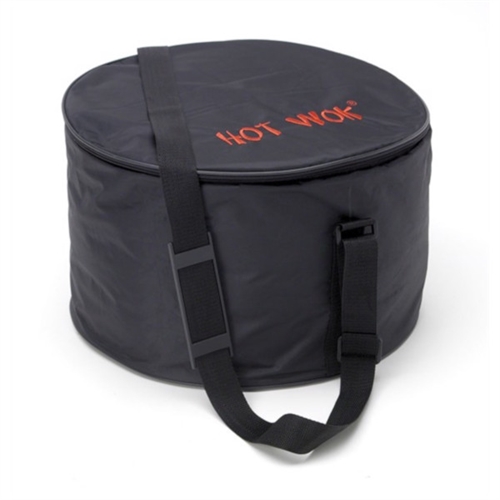 Rund, svart väska med "HOT WOK" i röd text. Justerbart rem för enkel transport.
