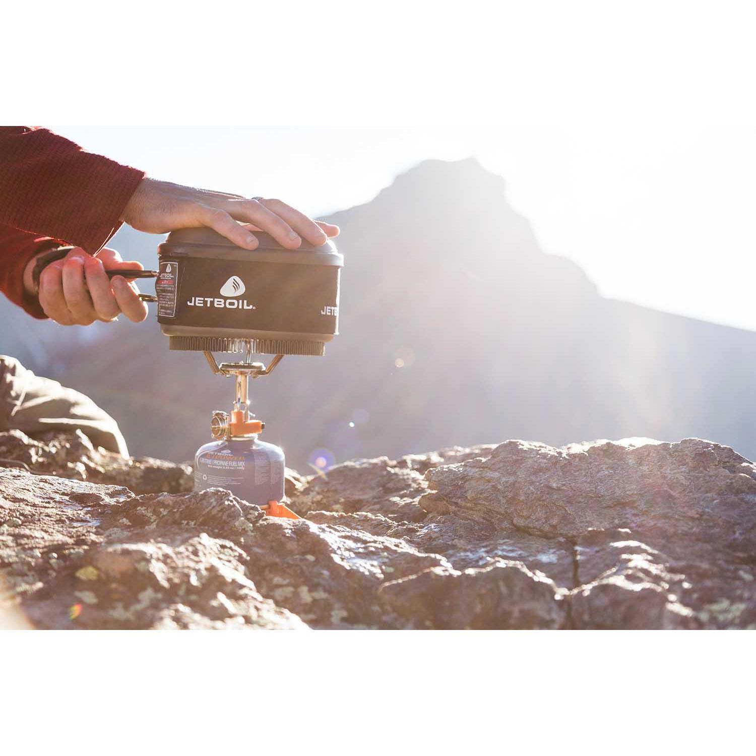 Med en vikt på endast 95 gram är JETBOIL MightyMo Brännare den idealiska lättviktslösningen för dina outdoor-äventyr. Den kraftfulla 3.000 watts brännaren kokar en liter vatten i en gryta med FluxRing, på 180 sekunder, vilket sparar både tid och bränsle på dina turer. Tack vare den pålitliga piezo-tändningen startar brännaren med ett tryck på knappen, även i kallt väder ned till -6 grader. Tryckregulatorn säkerställer en stabil låga under alla förhållanden, och de medföljande stödbenen till din gasbehållare ger solid stabilitet till din matlagningsutrustning. Med en bränsleförbrukning på 12 liter vatten per 100 g gas får du maximal användning av din gasbehållare (EN 417).