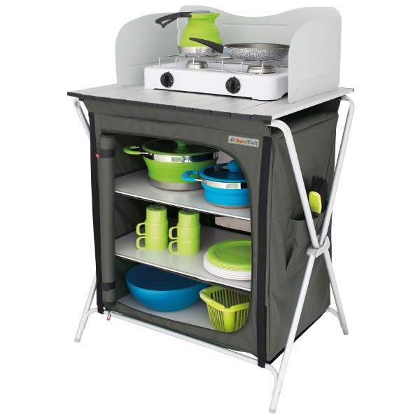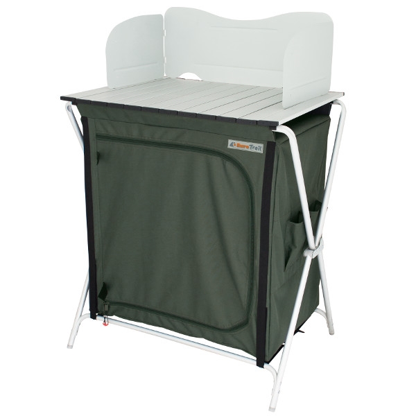 Hopfällbart köksbord med alluminiumtopp och vindskärm.