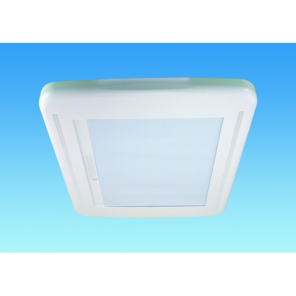Kvadratiskt ventilationsgaller med rundade hörn och ventilationsslitsar på två sidor.