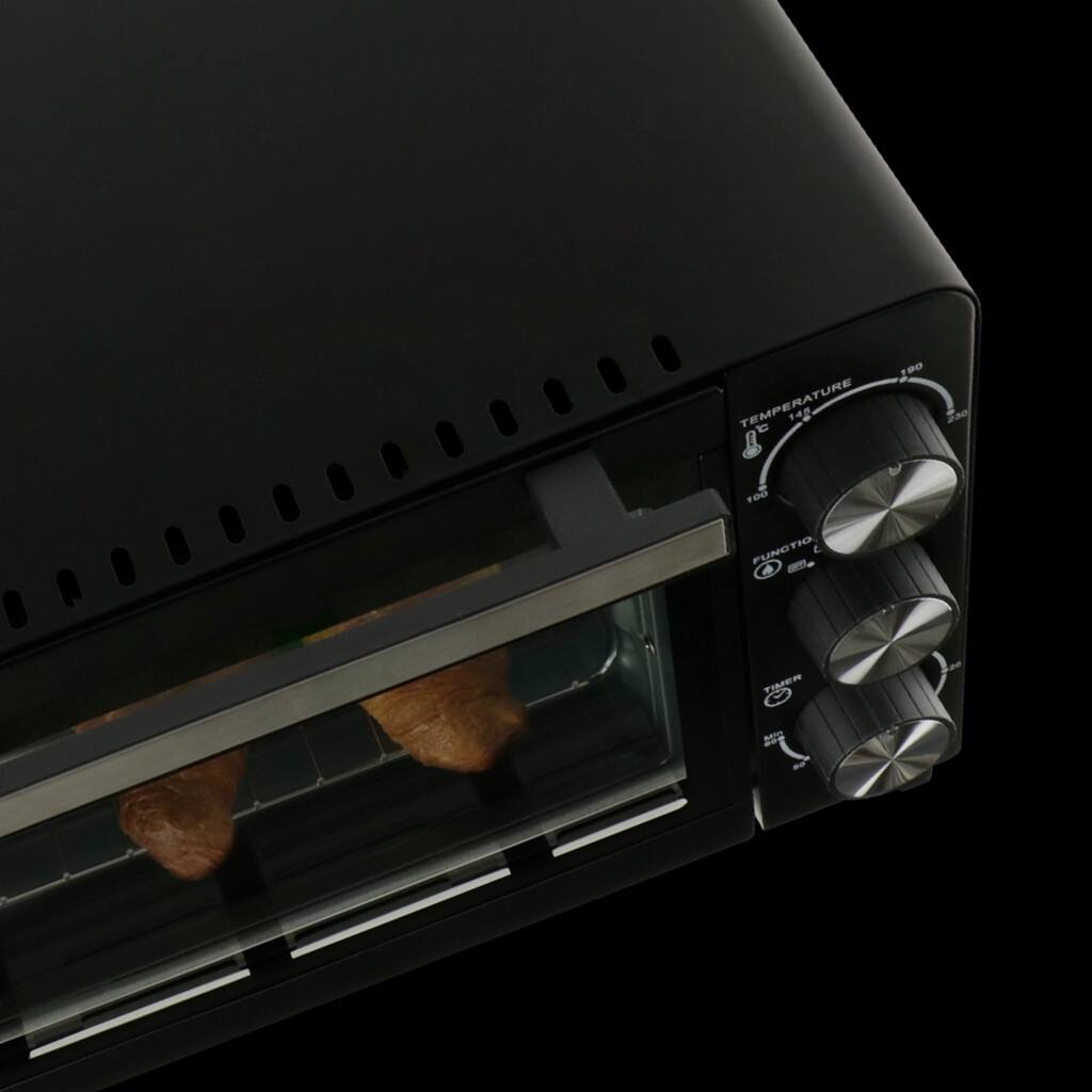 Ugnens mått på 43 x 34,5 x 28,5 cm gör den enkel att placera på köksbänken, medan vikten på 6,5 kg betyder att du kan flytta den mellan huvudbostaden och fritidshuset utan besvär. Den dubbelglasade dörren förhindrar värmeförlust och håller utsidan svalare att röra vid. Överhettningsskyddet säkerställer trygg användning, även när du inte konstant har uppsikt över ugnen.