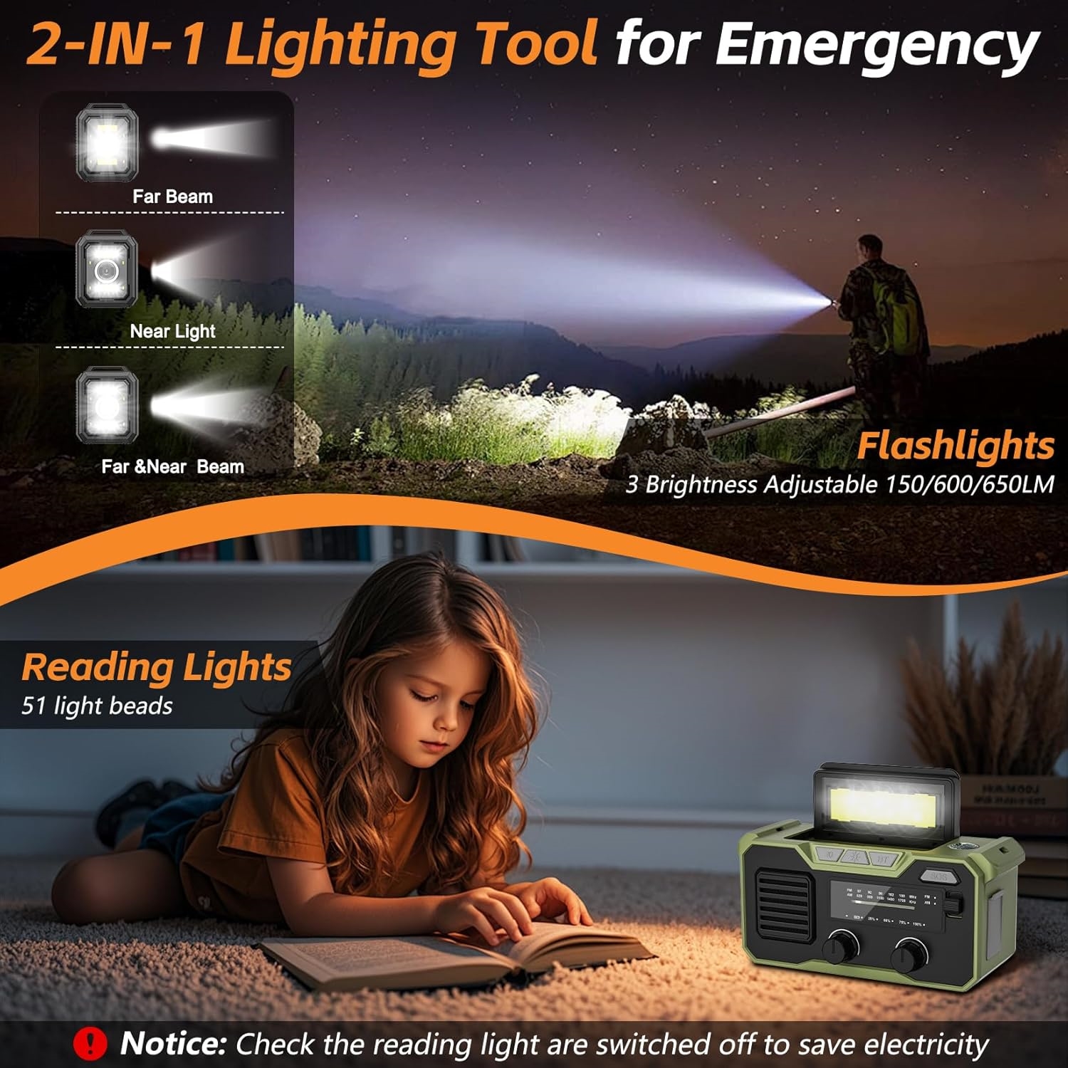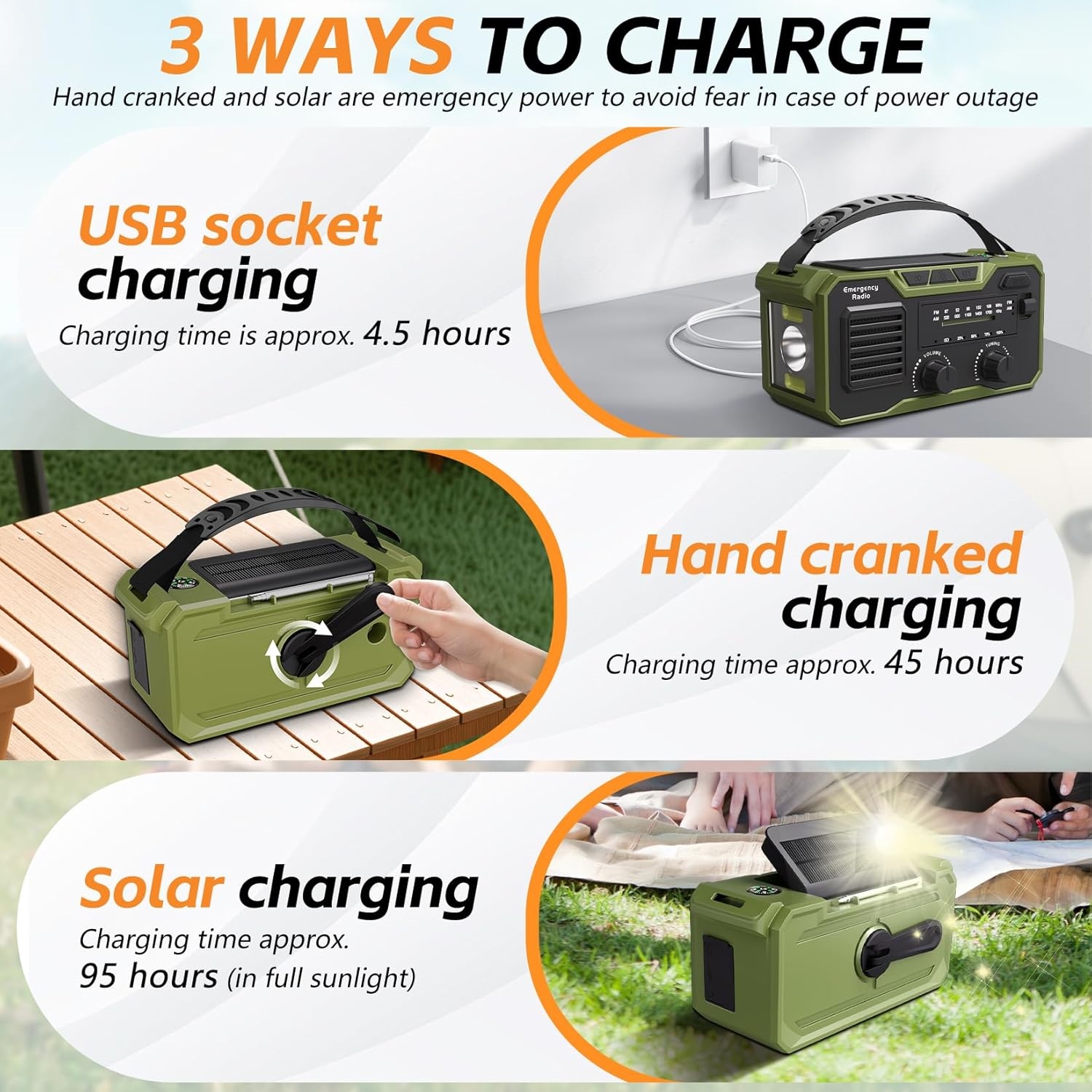 Den här robusta nödradion med den extra stora 27.000 mAh powerbanken säkerställer pålitlig strömförsörjning och kommunikation när det är som mest kritiskt. De tre laddningsmöjligheterna via USB, handvev och solpanel garanterar att du alltid har tillgång till ström - även under långvariga strömavbrott. Radion täcker både FM och AM, så att du kan ta emot viktiga nödsändningar och hålla dig uppdaterad. Med Bluetooth 5.3 och 3,5 mm hörlursuttag får du flexibla möjligheter att ansluta externa enheter. Den inbyggda SOS-sirenen och tre LED-belysningsfunktioner ger dig extra säkerhet i kritiska situationer. Den robusta designen och den inbyggda kompassen gör enheten idealisk för både beredskap och utomhusaktiviteter.