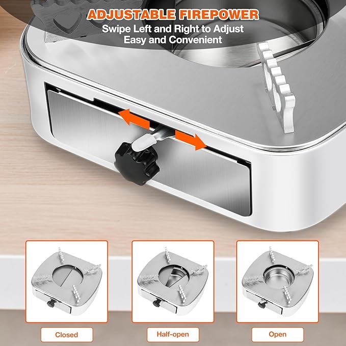 Konstruktionen i rostfritt stål och aluminiumlegering håller både vikten nere och säkerställer hållbarhet under tuffa förhållanden. Fyra stödarmar ger ett fast stativ så att din kastrull står säkert, även när underlaget är ojämnt. Låd-designen innebär att du kan fylla på bränsle utan att flytta kastrullen från brännaren - det sparar tid och minskar risken för spill. Apparaten fungerar med kastruller som har en diameter på minst 13 cm.