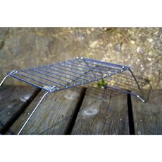 Liten, hopfällbar eldstadsgrill med metallgaller och stabila ben. Designad för kompakt förvaring.