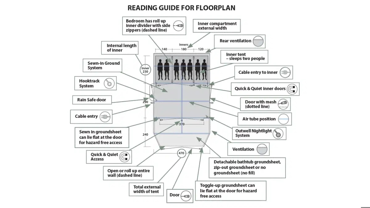 Fukt från marken tränger ofta genom tältbottnar och skapar obehag. Den dubbelt belagda polyetylenbotten håller vattnet ute, även när tältet står på vått gräs i flera dagar. Kondens på insidan av tältet uppstår vid temperaturskiftningar mellan dag och natt. Polycotton-materialet absorberar fukten och minskar droppbildning avsevärt jämfört med syntetiska alternativ. Tält har många praktiska och genomtänkta funktioner och bär spår av Outwells många års erfarenhet med tältproduktion.
