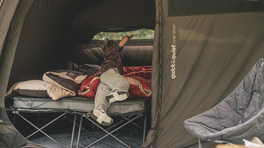 Familjer anländer ofta till campingplatsen efter flera timmars körning, där barnen är trötta och otåliga. Traditionella tält med stångkonstruktion kräver 30-45 minuter att resa, vilket förlänger väntetiden innan familjen kan koppla av. One Air System med nio minuters uppsättningstid för inflyttning betyder att sovkabinerna snabbt är redo för användning, medan de sista detaljerna färdigställs.