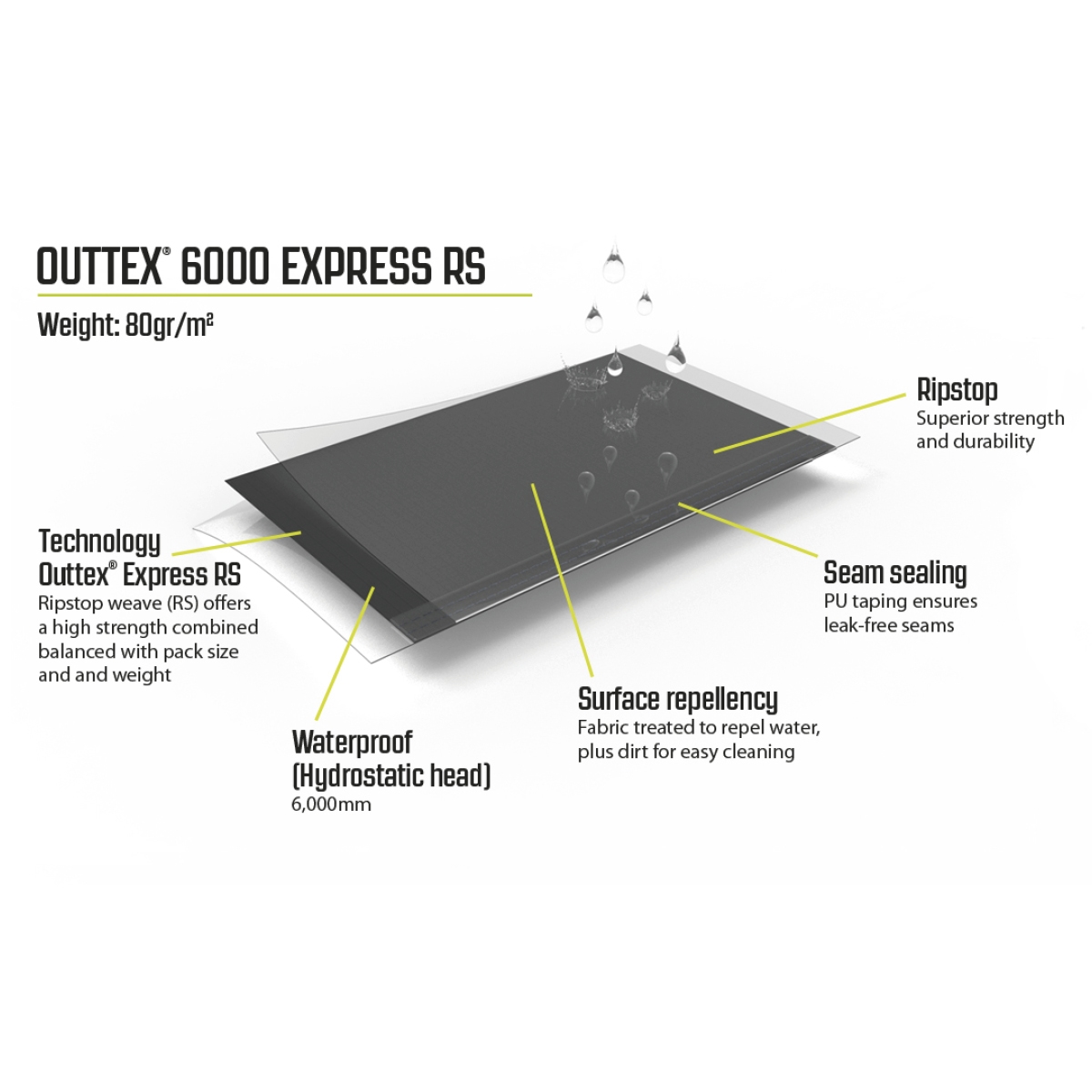 Fortältet väger 23,1 kg och mäter 78 x 37 x 41 cm ihopfällt. Luftkanalerna ger bra takhöjd och rymdkänsla med en takanslutningslängd på 250 cm. Framväggen kan öppnas helt eller delvis med nätpanel bakom, vilket ger flexibilitet i förhållande till ventilation och utsikt. Det högpresterande Outtex 6000 Express RS-materialet med 6000 mm vattenpelartryck skyddar dig mot regn och fukt. Den sydda botten håller insekter ute, medan UPF 30+ skyddet värnar om solens strålar. HookTrack-systemet låter dig hänga upp ljus och utrustning upp till 1,5 kg, och de förmonterade lysande linorna gör uppsättningen enkel. Fortältet har praktiska detaljer som kraftiga, driftsäkra dragkedjor och en golvduk med inbyggt dragavskärmning.