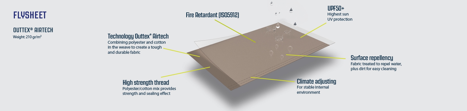 Fukt från marken tränger ofta in genom golvet och skapar obehag på natten. Det dubbelskiktade polyetengolvet skyddar mot detta problem. Vi rekommenderar alltid att köpa till ett tältunderlag för skydd mot vassa stenar som man ofta finner på campingplatsen. Detta förlänger tältets livslängd. Dålig ventilation leder till kondens varma sommardagar, men de två dörrarna med mesh-paneler säkerställer luftcirkulation. Polycotton-tyget i bomull minskar kondens ytterligare och skapar ett behagligt inomhusklimat vid längre vistelser i naturen, särskilt i varmare områden.