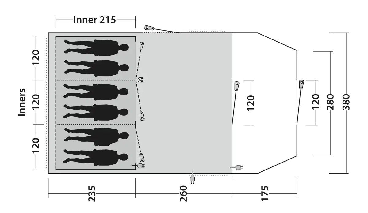 Förgård, vardagsrum och sovavdelning fungerar som separata områden som tillgodoser olika behov. Förgården ger plats för förvaring av blöta kläder, skor sparkcykel m.m. och möbler utan att föra in smuts i vardagsrummet. Vardagsrummet fungerar som gemensamt område där familjen kan äta och umgås, medan de två sovrummen ger avskildhet för barn och vuxna. Denna indelning minskar stök och skapar struktur i vardagen på campingplatsen. Det integrerade Outwell Light System med justerbar belysning gör det enkelt att navigera mellan zonerna efter mörkrets inbrott. Flera förvaringsfickor är integrerade i tältet för att hålla ordning på småsaker.