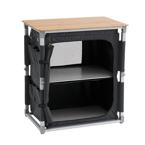 Detta praktiska förvaringsskåp öppnas och fälls ihop på några sekunder, vilket gör det idealiskt för campinglivet. Med två huvudfack, sex förvaringsfickor och en robust bambuskiva på toppen får du en effektiv förvaringslösning. Skåpet är utrustat med nät för luftcirkulation, som förebygger fukt och lukt, samt en utdragbar hållare för diskbalja. Du kan bland annat använda skivan för köksbord och eventuellt till en gasbrännare.