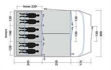 • 3 sovkabiner och 1 vardagsrum med integrerat förtält