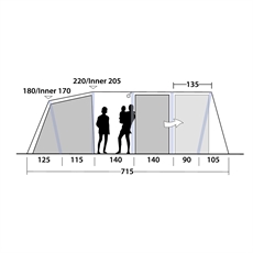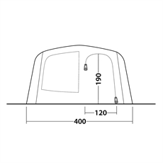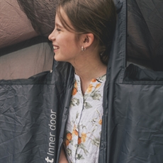 De sex separata rummen skapar effektiva zoner för både vila och aktivitet. Konstruktionen erbjuder bra ståhöjd genom hela tältet, medan de formade luftstängerna säkerställer maximal rymlighet. Flera ventilationsmöjligheter och nätpaneler i dörrarna håller inomhusklimatet behagligt under längre vistelser. Den extra sidodörren med nätpanel ger flexibel åtkomst och bidrar till god ventilation i tältet.