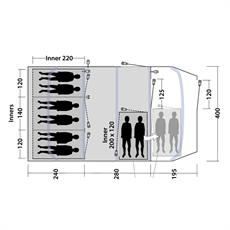 Detta tunneltält med sex separata rum är utvecklat för effektiv inkvartering av större grupper på upp till 8 personer. Den genomtänkta rumsindelningen säkerställer optimal avskildhet, medan det avancerade Rigid Air System med 9 psi luftstänger ger en stabil konstruktion. De mörka Premium sovkupéerna med nätventilation är utformade för att skapa goda sovförhållanden, och det höga vattenpelartrycket på 4000 mm ger skydd mot kraftigt regn. Tältet är utrustat med en dubbelcoated, vattentät polyetylenbotten som ger extra skydd mot fukt från marken.