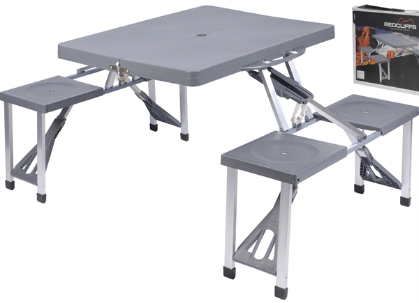 Det här grå picknickbordet från Redcliffs ger dig en komplett lösning för utomhusmåltider med integrerade bänkar för fyra personer. Bordet fälls upp och ner på några sekunder, vilket gör det enkelt att transportera till campingplatsen, där snabb montering betyder mer tid för att njuta av naturen. Konstruktionen i aluminium och plast håller vikten nere, så du kan bära det mellan olika platser på festivaler utan problem. När du behöver extra bordutrymme i trädgården för större sammankomster, fäller du bara upp det – och när festen är slut, förvarar du det kompakt.