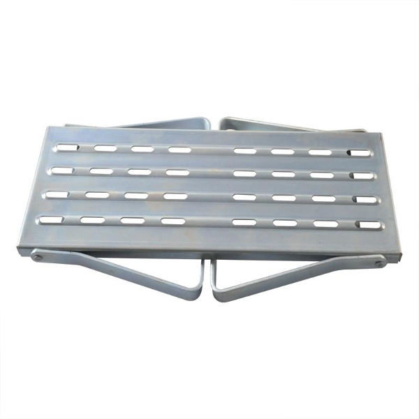 Hopfällbart trappsteg med rektangulär form och slitsad yta, fällbara ben.