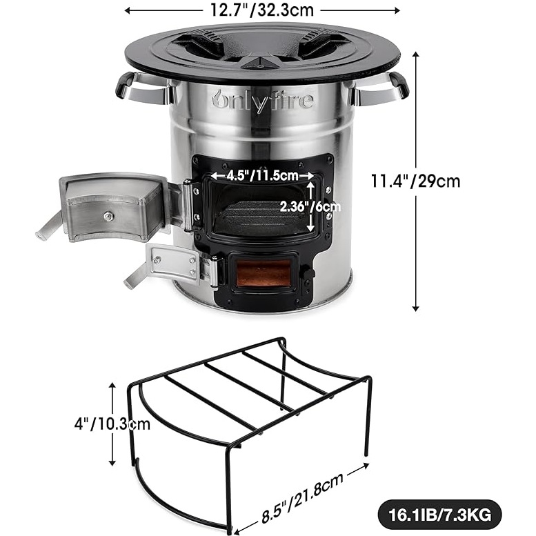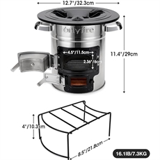 Denna rocketstove är konstruerad i rostfritt stål, vilket ger dig hållbarhet och motståndskraft i alla väderförhållanden. Med dimensioner på 32,3 cm i diameter och 29 cm i höjd väger den 7,3 kg. Gjutjärnsgrillplattan säkerställer jämn värmefördelning, så din mat tillagas enhetligt varje gång.