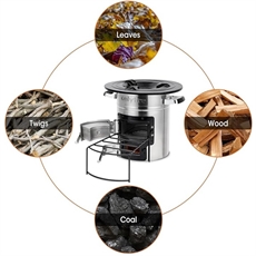 Om du ofta befinner dig utan traditionellt bränsle ger denna rocketstove dig frihet. Du kan elda med trä, pellets, löv, grenar eller kol - beroende på vad som finns tillgängligt. Den cylindriska designen med toppöppning fungerar med dina kastruller, stekpannor och grillplattor.