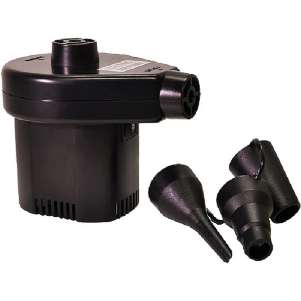 Svart elektrisk pump med tre munstycken, kompakt design, två strömingångar, idealisk för resebruk.