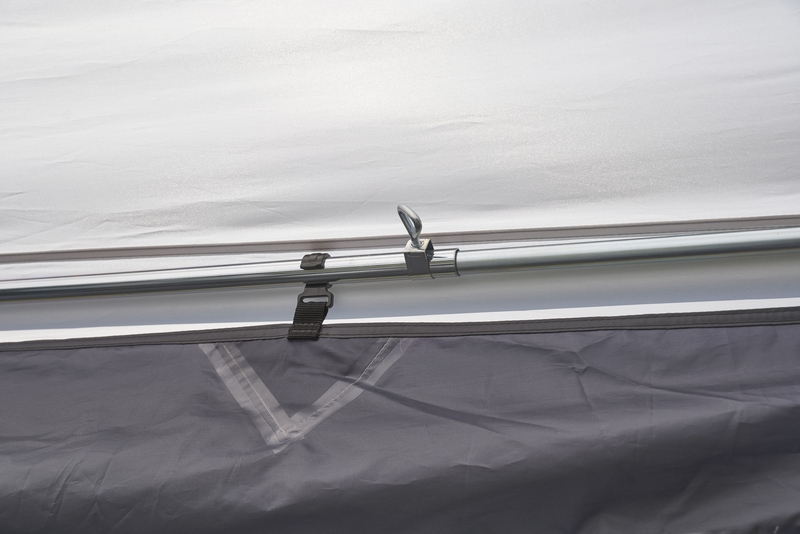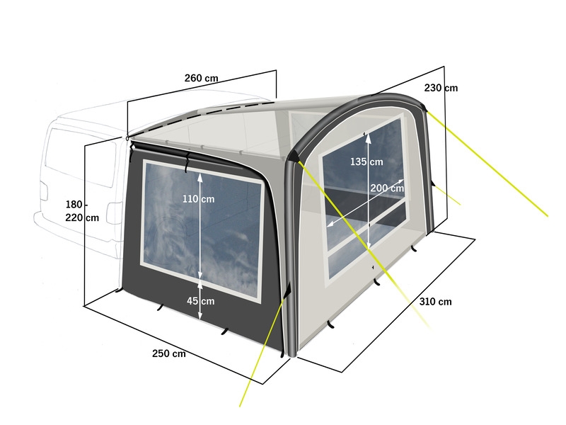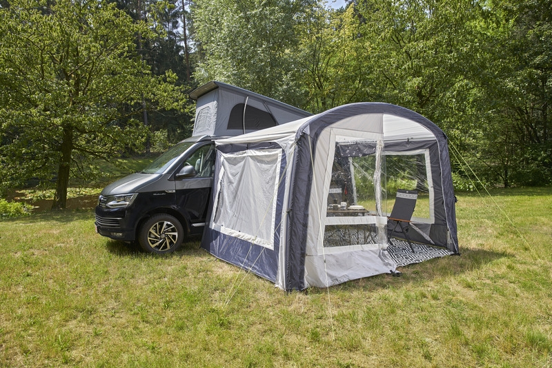 REIMO Antigua Air solsegel för t.ex. VW-buss och husbil är ett praktiskt förtält med snabb uppställning via en luftslang. Det har stora fönster med gardiner och kan monteras med både vulst ø5 eller 8 mm, låsstång och öglor. Sidoväggarna fästs och fronten har dragkedja. Solseglet passar fordon med höjd från 180 till 220 cm och har en vattenpelare på 3.000 mm för effektivt skydd mot regn.