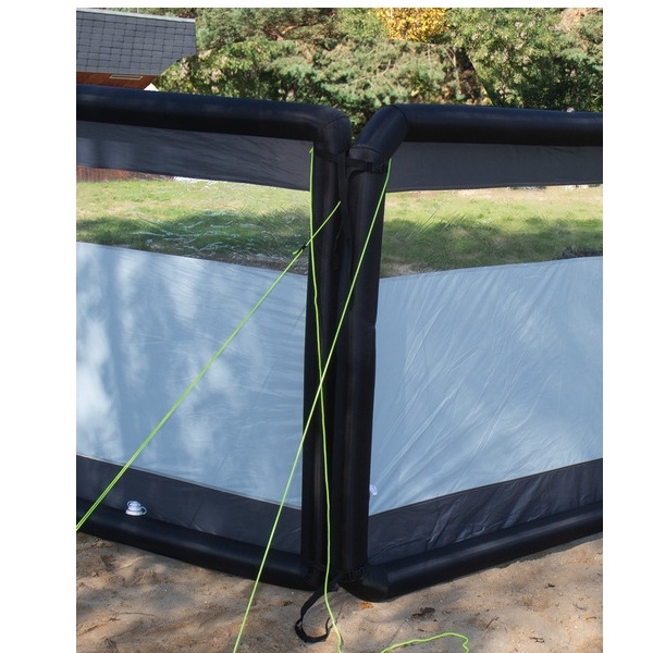 Uppblåsbar vindskydd vid vattnet med tre paneler och klara fönster, säkrad med linor.