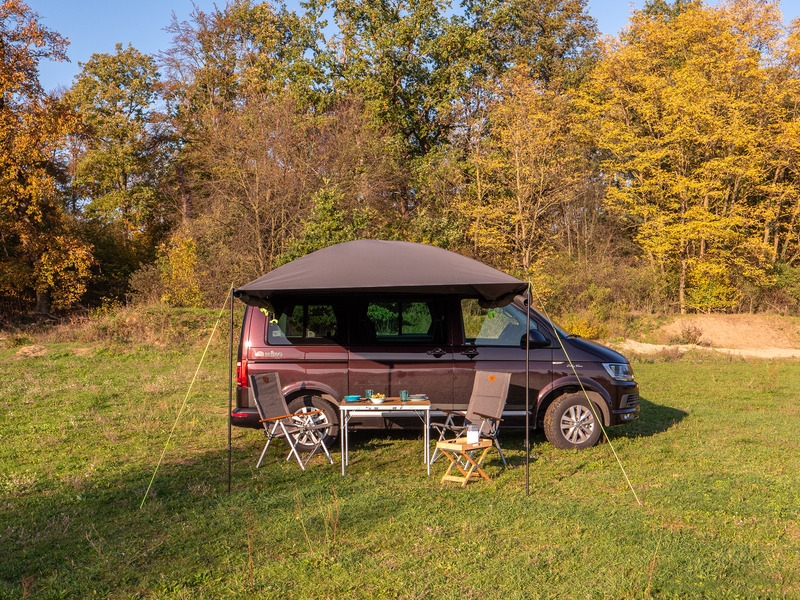 Kuppeltaket med 2 diagonala stänger (glasfiber) imponerar med en behaglig ståhöjd och förhindrar bildande av vattenfickor vid regn.
