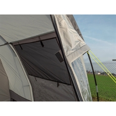 REIMO Tour Action 7 Busstält 2 tunnlar busstält med glasfiber- och stålstänger. Tältet har en sluss på 90 cm med dörrar på vänster och höger sida. I själva tältet är alla fönster tonade för mer privatliv. Framdörren är stor och kan användas som markis. Lämpligt för t.ex. VW T3, T4, T5 och T6 Golvet är ett Hook-in floor; enkelt och snabbt. Det är möjligt att ansluta tältet till fordonet med hjälp av vulstband på 5 eller 8 mm eller linor. Specifikationer: Dimensioner: B: 300 x D: 310 x H: 210 cm. Packstorlek: 75 x 26 x 37 cm. Material: 100% Polyester 190T med förseglade sömmar. UV-skydd: Ja. Vattenspelare: 2.000 mm. Stänger: Glasfiber och stål, Ø = 19/13 mm. Vikt: 19 kg.