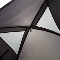Tältet väger endast 4,5 kg och är lätt att transportera i den medföljande förvaringsväskan. Konstruktionen består av hållbar polyester och PE-material med glasfiberstänger, som säkerställer stabilitet. Den mörkgrå färgen håller sig fin, även efter längre tids användning utomhus.