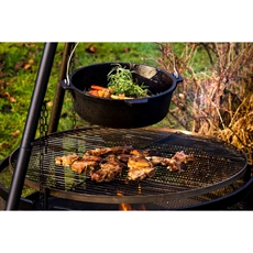 Denna robusta gjutjärnsgryta är skapad för utomhusmatlagning med sin utmärkta värmefördelning och hållbara konstruktion. Med en rymlig kapacitet på 5,5 liter kan du tillaga mat för större sällskap, oavsett om det är över öppen eld eller grill. Grytan är lätt att rengöra och underhålla, även under primitiva förhållanden.