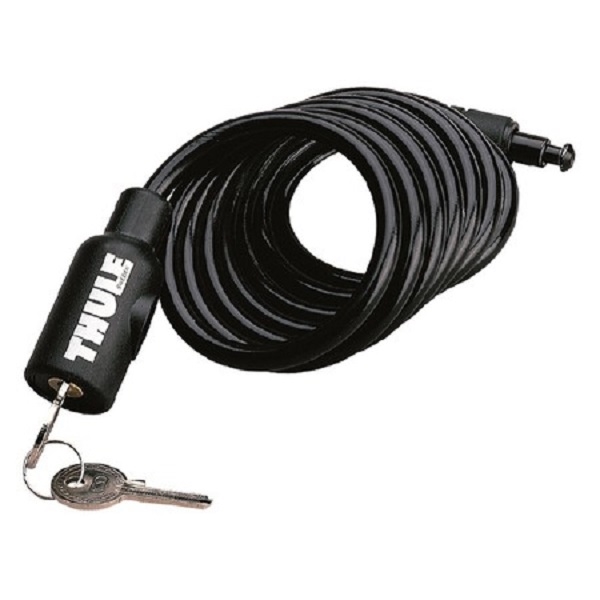 THULE cykellås, 180 cm, med låsmekanism och två nycklar bredvid.