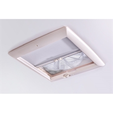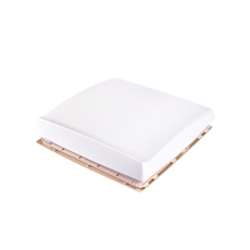 Vit taklucka med fläkt, låg profil, idealisk för husvagnar eller husbilar.