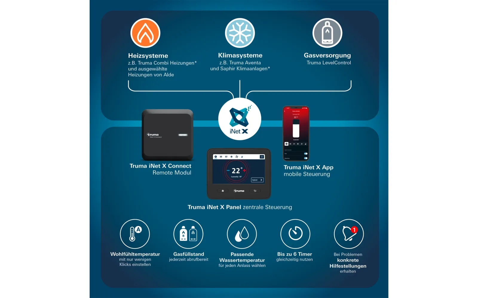 Styr ditt Truma CP plus-system var som helst i Europa via Truma App. iNet X Connect-modulen ger dig fjärrstyrning via 4G/LTE och integrerat eSIM, så att du kan justera klimatsystemet från avlägsna platser under långdistansresor med husbil. iNet X-panelen fungerar som det centrala styr- och kontrollsystemet med en 4,3 TFT-LCD-skärm, som ger dig full kontroll över anslutna enheter.