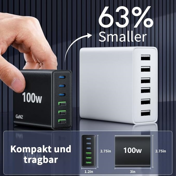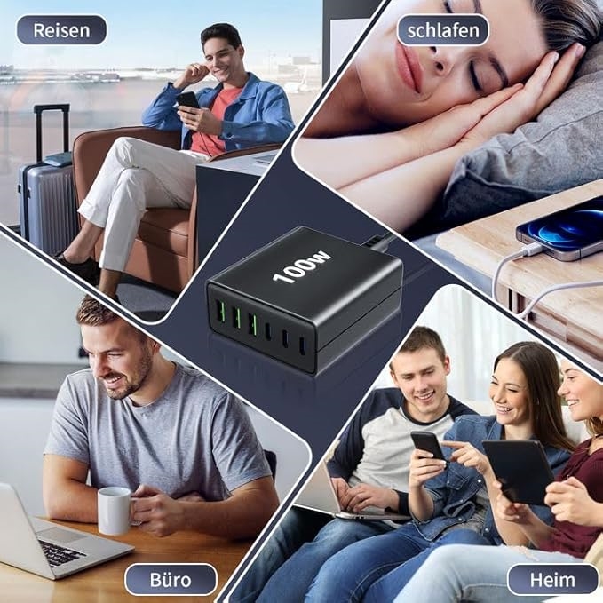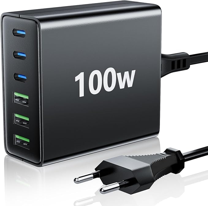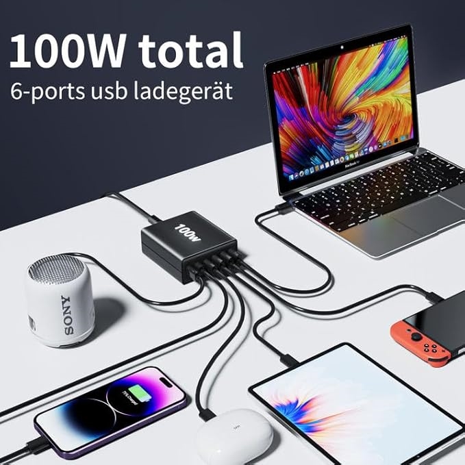 Med denna 100W USB-laddare får du möjlighet att ladda upp till sex enheter samtidigt. Den höga totala effekten säkerställer stabil ström till alla anslutna enheter, vilket är perfekt för personer som behöver snabb laddning. De tre USB-C- och tre USB-A-portarna ger flexibilitet för både nya och äldre enheter.