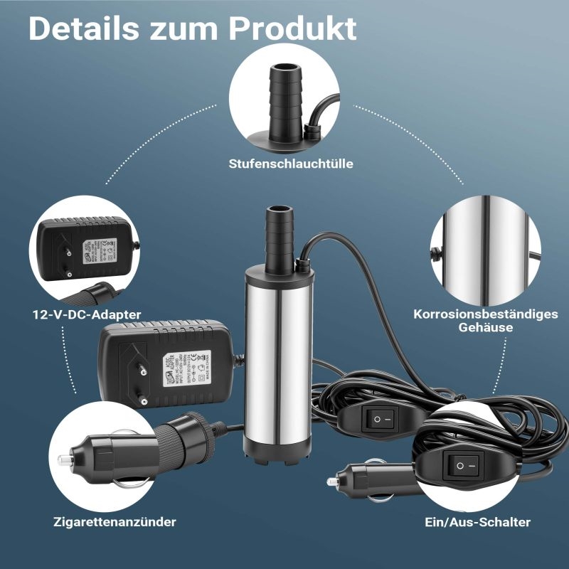 • Inkluderat: pump, 12V-adapter, cigarettuttag och kabel med brytare